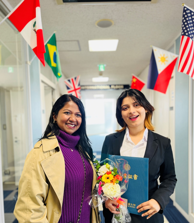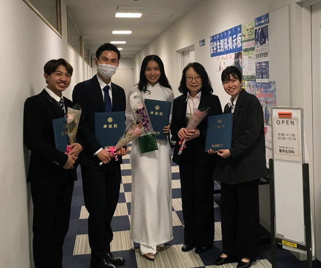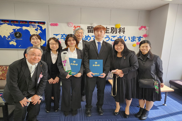 2024年3月15日に卒業式が行われました。中国とスリランカの2名の学生が参加しました。入学当初、なかなか日本語でのやり取りが難しかった学生も、今では笑顔で話せるようになりました。この1年は日本語だけでなく、大学のイベントやサークル活動にも積極的に参加し、新しい仲間と出会った1年でもありました。これから、それぞれの未来に向かって新たな一歩を踏み出します。