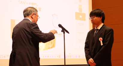共通テーマ「AIと言語」に沿って発表が行われ、ヨウ ハイリさんが優秀賞を受賞しました。AIと言語学習について、自身の経験を熱く語り、観客に深い印象を残しました。