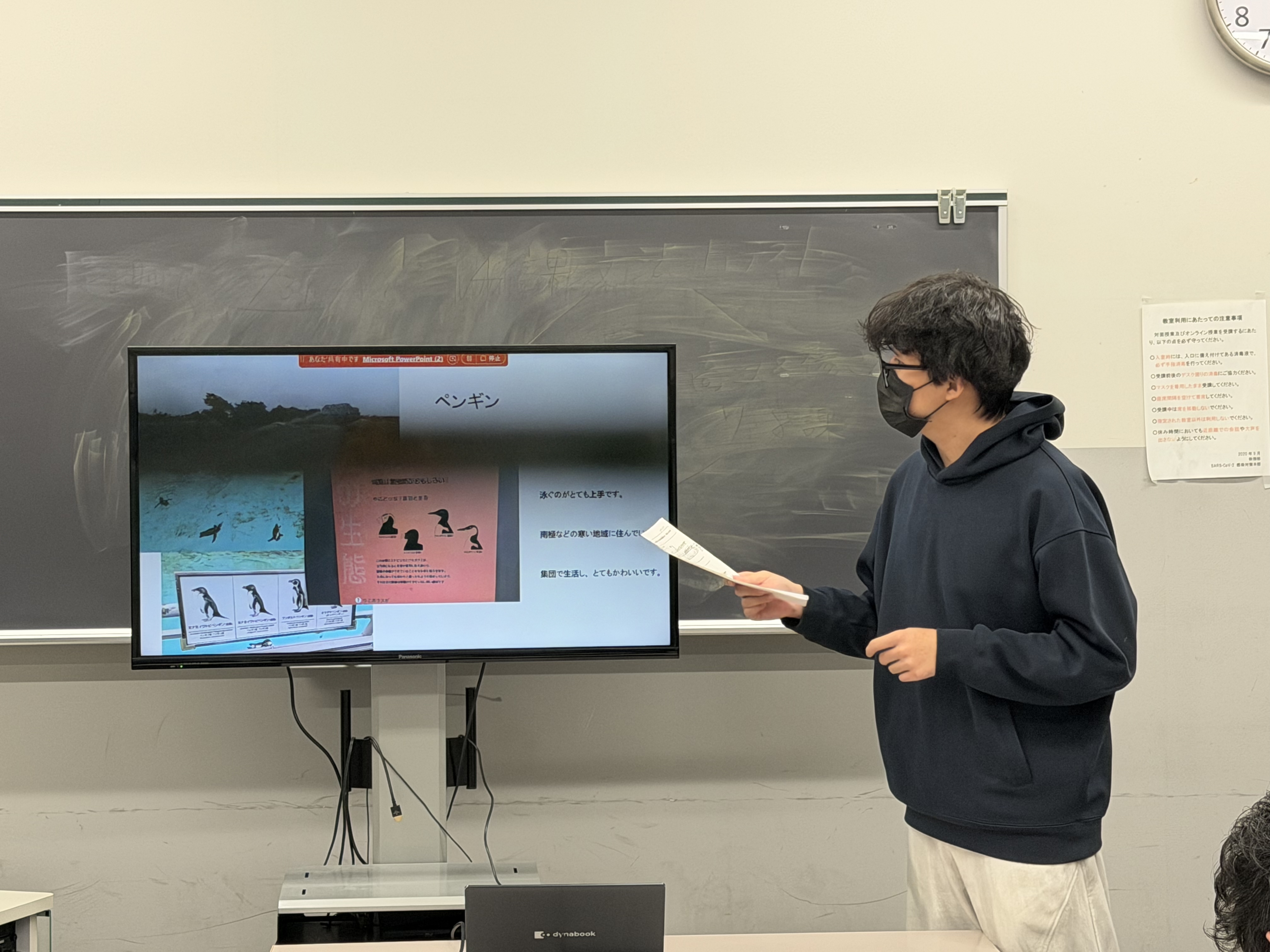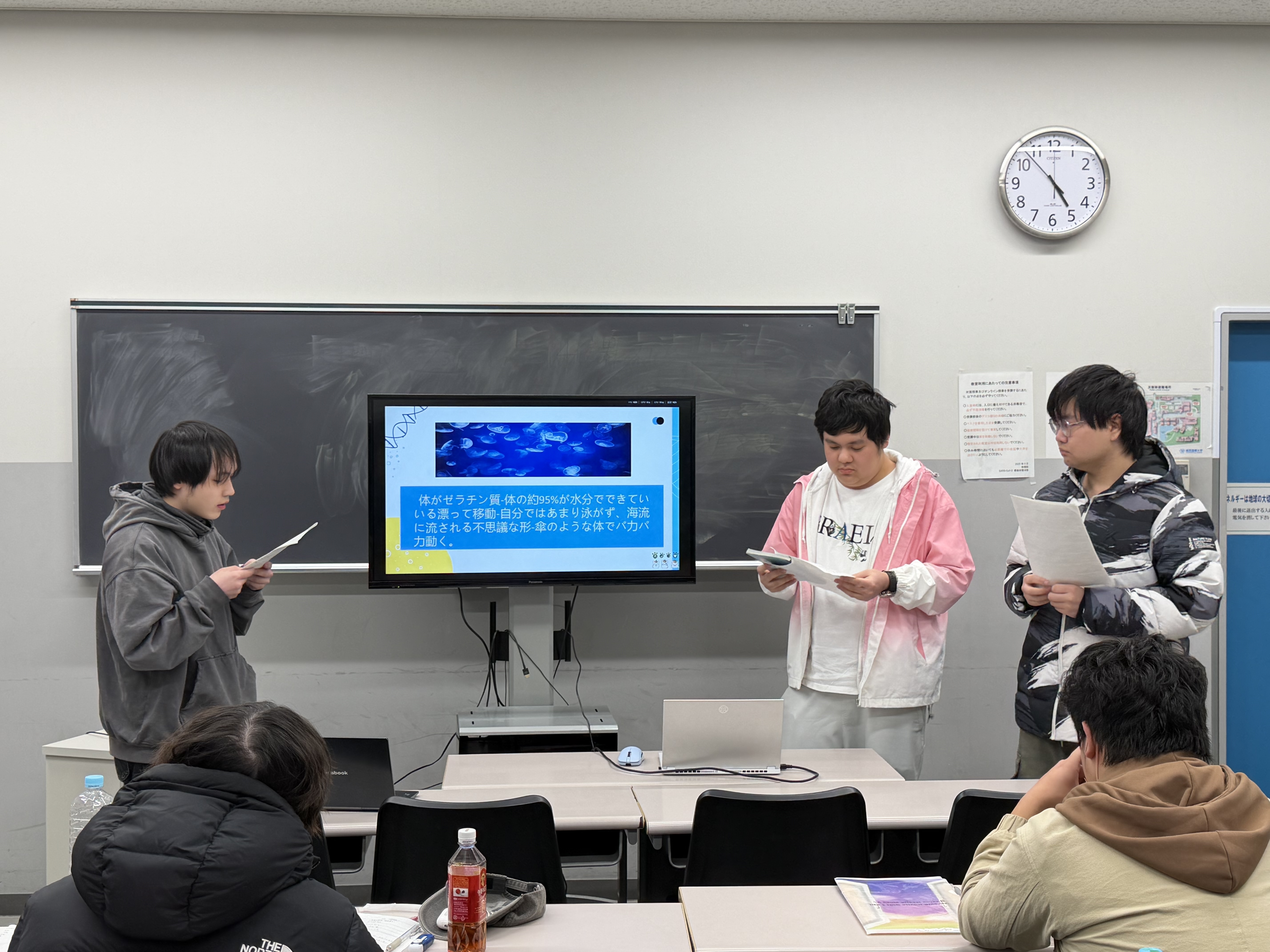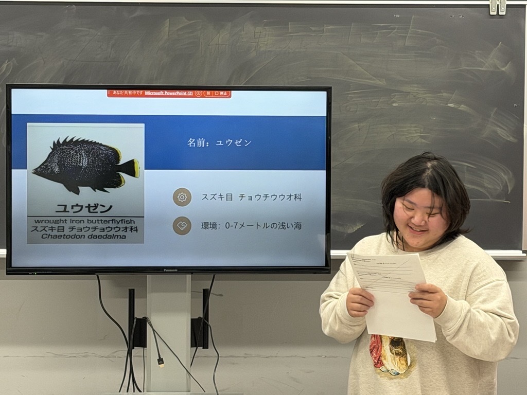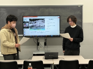 2025年12月に日本文化研修の授業の一環として訪問した「葛西臨海水族園」での学びをグループで発表しました。グループごとにテーマを決め、テーマについて調べ、PPTを作成、発表を行いました。また、テーマについてのプレゼンに加え、「葛西臨海水族園」で見学した海洋生物の中から自分が気に入った生き物を2つずつ紹介しました。