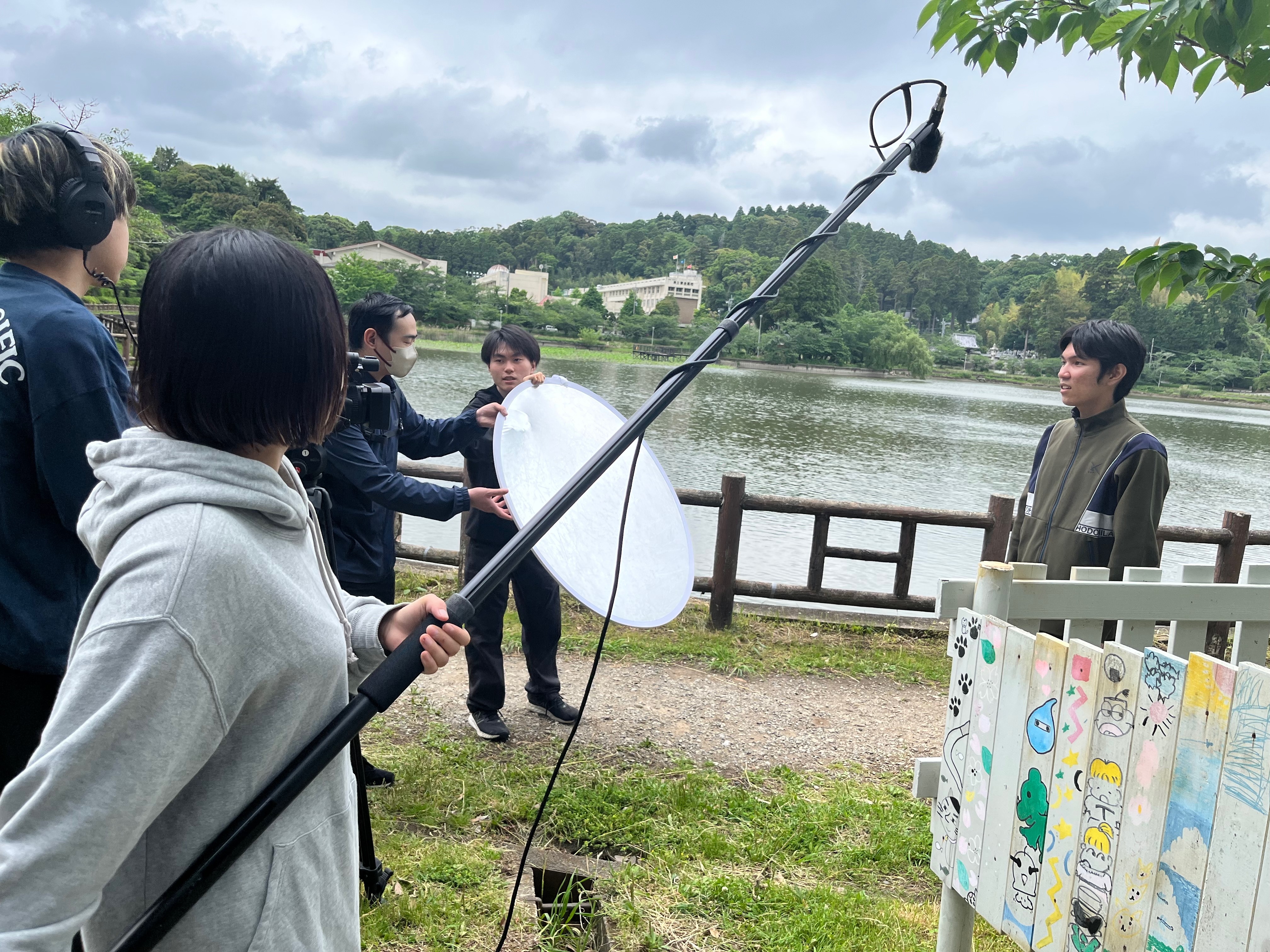 専門は映像や音声、テレビそのものを扱う芸術「ビデオアート」です。本学メディア学部では2年生以上を対象に「スタジオ番組」という講義、演習を行っており、私はこれを担当しています。テーマは八鶴湖周辺の歴史的景観です。八鶴湖は東金駅から西に500mほどの場所にある湖で、徳川家康らが鷹狩の際に利用した「東金御殿」築造の際に池を広げた御殿池です。歴史の深い湖の周囲には、東金御殿跡の東金高等学校や北原白秋などの文人が訪れた「八鶴館」や、最福寺、本漸寺もあり、文化の中心地であったことが伺える場所です。