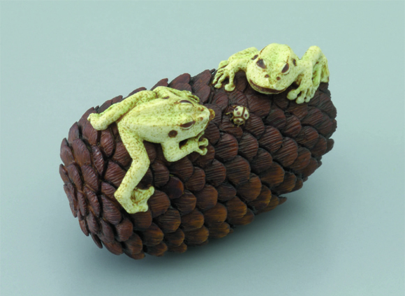 高円宮妃久子殿下は、英国での大学時代に根付に出会われました。そして、高円宮憲仁親王殿下(1954-2002)とご一緒に、国内外の作家による優れた現代根付や古根付を蒐集されてきました。根付は印籠や煙草入れなどを着物の帯から下げるための留め具で、木彫や牙彫、蒔絵、彫金などの技巧が凝らされた小さな工芸品です。江戸から昭和初期までの「古根付」に対し、現代作家が伝統技術を継承しながら、新しい素材や題材も取り入れ制作したものを「現代根付」と称します。