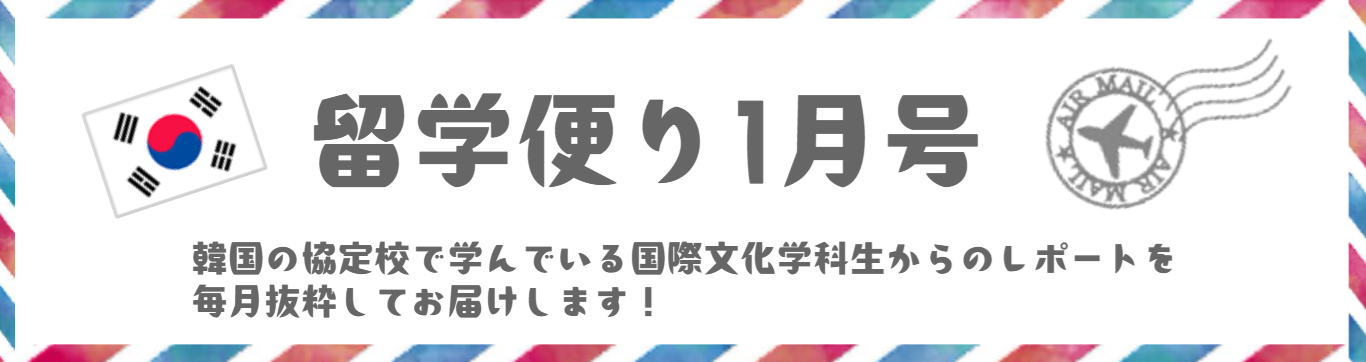 こんにちは。韓南大学に留学している国際文化学科の福田です。年が明けて1月2日から語学堂の授業が始まり、9日には中間試験がありました。冬学期は単語や内容が少しずつ難しくなってきたので勉強量を増やし、復習もしっかりするようにしていました。その結果、中間試験では良い成績を取ることができました。