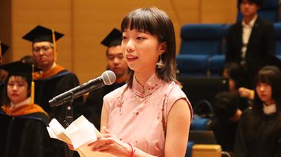 畢業生代表Hikona Roh女士(觀光學院)談到了她在COVID-19大流行期間出國留學時感到的孤獨和沮喪,並被迫深入思考她是誰以及學習意味著什麼“學習不是按照老師的指示'學習'一些東西,而是問自己想成為什麼樣的人,以及為此需要知道什麼。我真的很感謝老師。”教會我這一點的老師、我周圍的人、我的家人以及我遇到的每個人,”他在回顧自己的大學生活時說道。