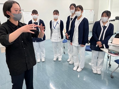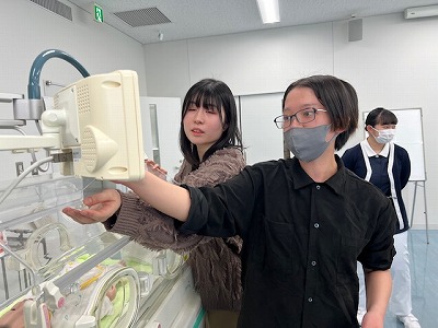 助産師課程卒業の先輩からNICUの保育器の説明や看護、分娩の様子を聞きました。