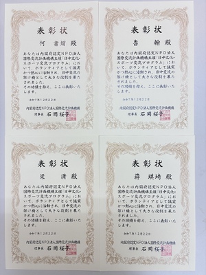 特に、初めて海外交流に参加する生徒や学生に対しては、言語面だけでなく精神面でも寄り添い、安心して交流に参加できる環境づくりに努めた点が高く評価されました。こうした姿勢は、国際交流の「架け橋」としての役割を果たし、この貢献を称え、活動終了後、表彰状が授与されました。