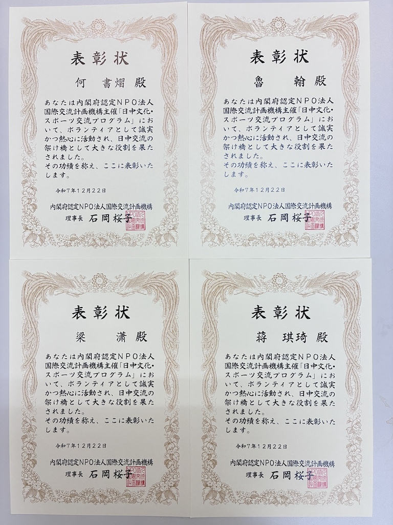 観光学部・于航(う・こう)ゼミナールに所属する留学生4名が、内閣府認定NPO法人 国際交流計画機構(東京都)が主催する「日中文化・スポーツ交流プログラム」において、通訳ボランティアとして参加し、その貢献が認められ表彰されました。
