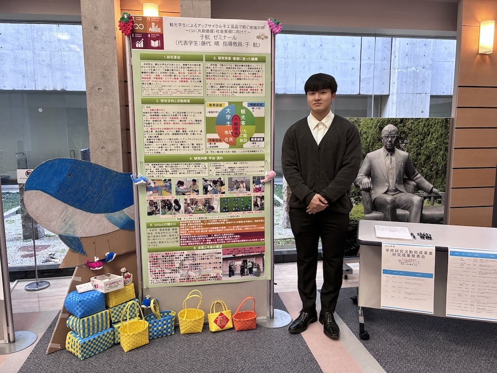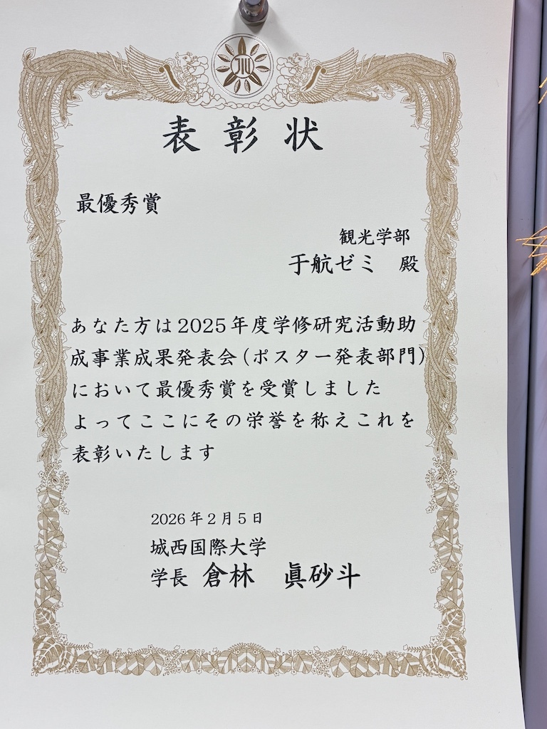 2026 年2月5日に、千葉東金キャンパスの水田記念ホールにて、2025年度学修研究活動助成事業成果発表会の表彰式があり 于航ゼミ(代表 藤代晴)がポスター部門で「観光学生によるアップサイクル手工芸品で紡ぐ地域の絆 ~CSV(共創価値)社会実現に向けて~」をテーマとした研究が「最優秀賞」を受賞しました。