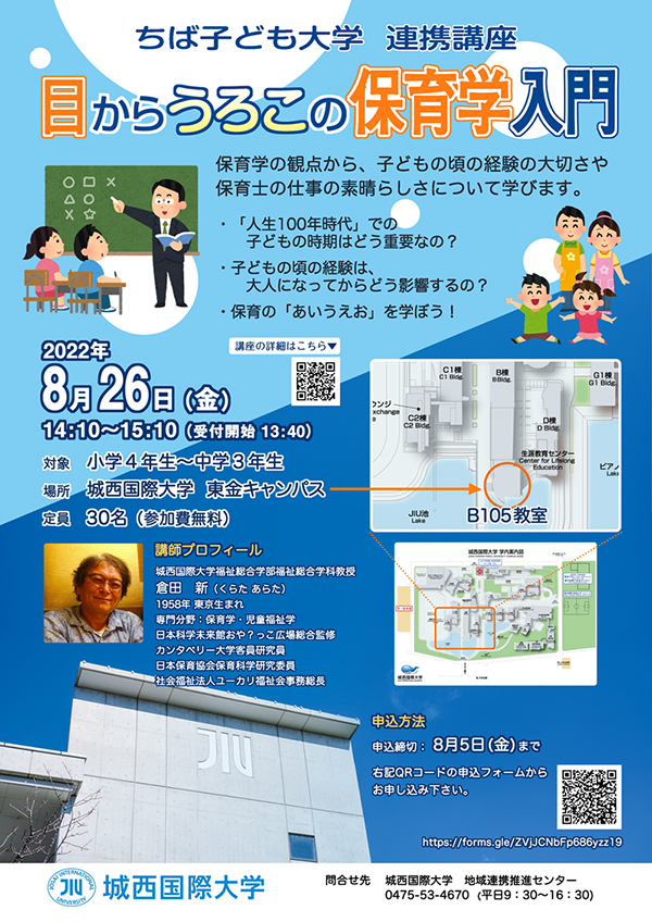 城西国際大学で、8月26日(金)にちば子ども大学連携講座を行います。