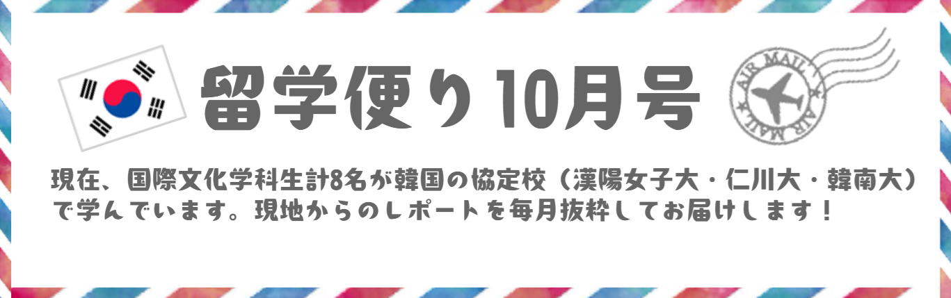 こんにちは。仁川大学に留学している国際文化学科2年の野口です。留学がはじまり約2ヶ月が経ちました。