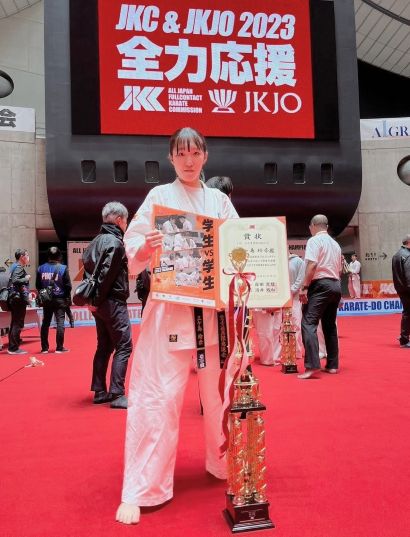国際文化コース4年生の三ヶ島玲奈さんは、2023年の第2回全日本学生フルコンタクト空手道選手権大会1部女子重量級で全国第3位の成績を収め、2025年には第17回JKJO全日本空手道選手権大会一般女子中量級の部で準優勝を果たすなど優秀な成績を残しました。加えて、同年の第4回全日本学生フルコンタクト空手道選手権大会で選手宣誓も行いました。