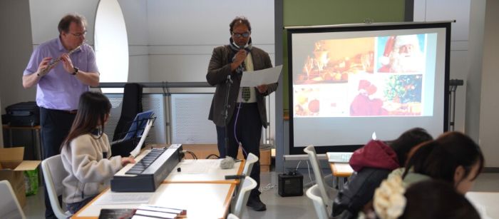 さらに、語学教育センター音楽団の学生なども参加し、受講生とともに演奏したり歌ったりしました。クリスマス・キャロルの多くは、イエス・キリストの誕生を題材としています。