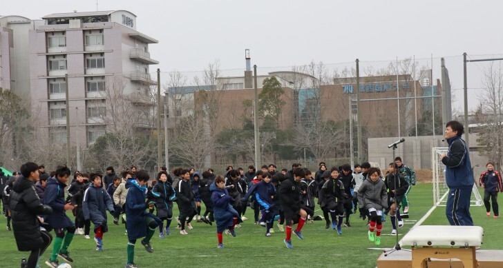 6年ぶりの開催となった今大会の運営や審判はこれまでどおり本学サッカー部が務め、朝から雪が降るあいにくの天候となりましたが、13チームがトーナメントの頂点をめざして、寒さを吹き飛ばす活躍を見せてくれました。開会式では、前回優勝チームのときがねFC(東金市)から川淵三郎杯の返還が行われ、また、理学療法学科の教員と学生による試合前のケガ予防としてFIFA11+からランニングエクササイズなどいくつかピックアップして10分程度にまとめた運動をするなど、あらたな試みも実施しました。また、今大会の開催を記念して公開講座も行われ、参加者はスポーツ傷害の予防や栄養面など、育成期の子どもに必要なテーマについて真剣な面持ちで耳を傾けていました。