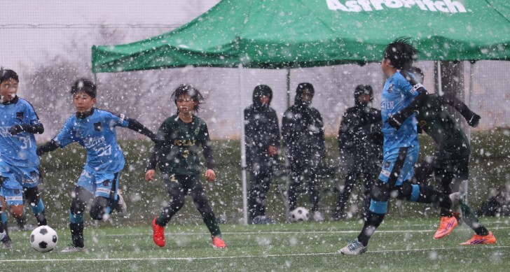 雪が降る中、ボールを追いかける選手たち