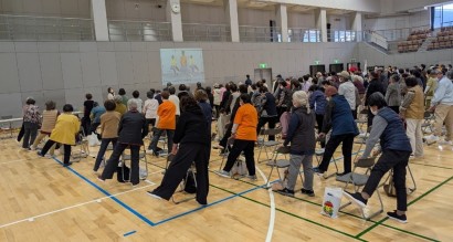 11月26日、旭市総合体育館メインアリーナ(千葉県旭市)において、旭市内の「通いの場」実施団体が一堂に会する全体大会が開催され、約160名の参加者が集まりました。本学は、この全体大会プログラムの一部として、転倒予防をテーマにした2つの公開講座を実施しました。今回は、本学理学療法学科の教員が以下の2テーマで講義と実技指導を担当しました。