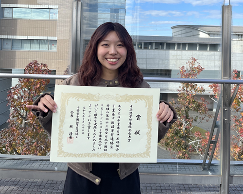 国際交流学科2年の黒藪さんが、2025年10月26日に開催された第43回全日本中国語スピーチコンテスト千葉県大会・朗読の部に参加し、大学生の部門で「中国語学習連絡会会長賞」を受賞しました。黒薮さんは中国語圏への留学を目指し、日頃から熱心に中国語の学習に励んでいます。今回の受賞は日々の努力が実を結んだ結果であり、同時に大きな自信にもつながったとのことです。