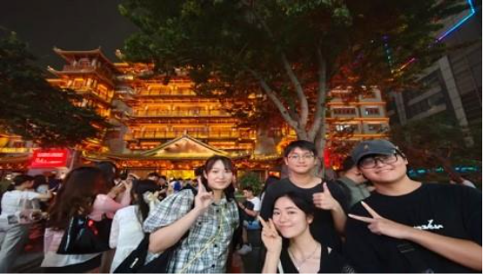私たちは4年生と3年生の2人で中国の広東外語外貿大学 南国商学院に11月5日から11月16日までの12日間、日本語教育実習を行っています。 休日には現地の学生に案内してもらい、中国の観光地を散策しました。北京路歩行街では沢山のお店が並んでいて、人も大勢いました。そこではCHAGEEという中国で有名なお茶を飲んだり買い物をしました。お昼には恒宝大酒楼という現地の人に人気のあるお店で腸粉(チャンフェン)や百合醤蒸などの名物料理を食べました。とても量が多くてお腹いっぱいになりました。その後は永慶坊を目指して上下九歩行街や西華路など寄り道をしながら向かいました。上下九歩行街や西華路は食べ歩きが出来るところが多く新しい観光地だという話を聞きました。永慶坊では漢服や民族衣装を着て写真を撮っている人がたくさんいました。最後に大仏寺に行きました。圧巻されるほどの迫力でとても綺麗でした。観光客もたくさんいて夜なのに賑やかでした。休日にも学生と交流ができて充実した休日になりました。