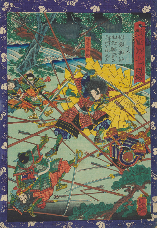 Fifty-four Scenes from the War Chronicle of Hideyoshi: No.18, Enju Tōsuke Retrieves the Horse Seal of Kazuie, His Lord