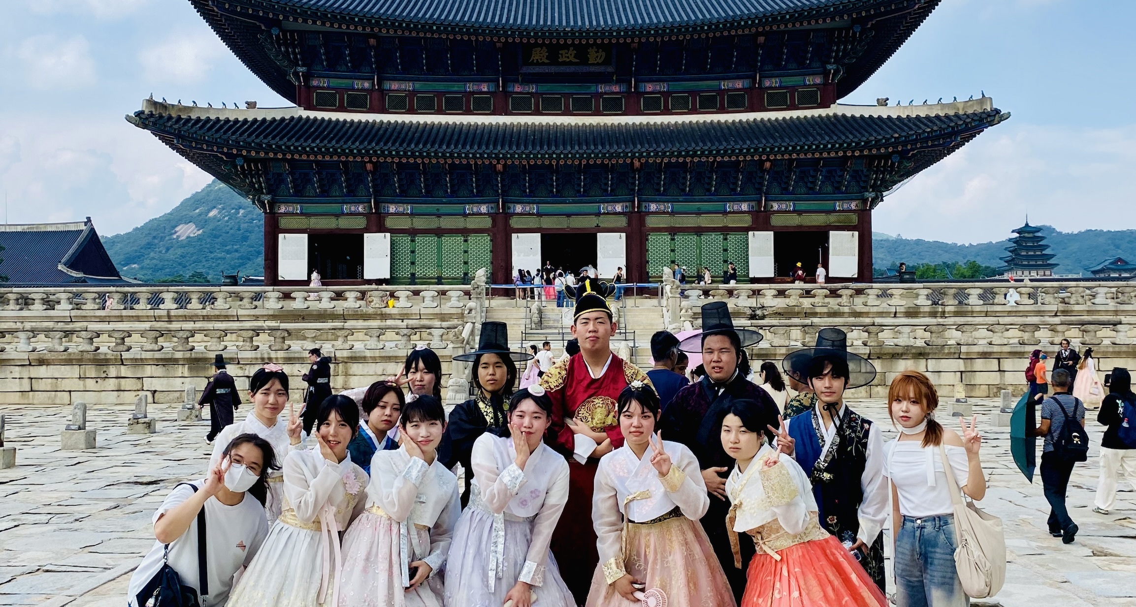 2025年度の韓国における海外短期留学プログラムでは、「専門教育や海外長期留学への志向を高めること」を目的に、「(1) 海外協定校との交流」、「(2) 観光関連交通機関への乗車」などを経験しながら、「(3) 世界遺産」や「(4) 伝統文化の現代的な活用事例」、「(5) 研修国独自の観光ブランディング事例」について学ぶ視察を実施しました。