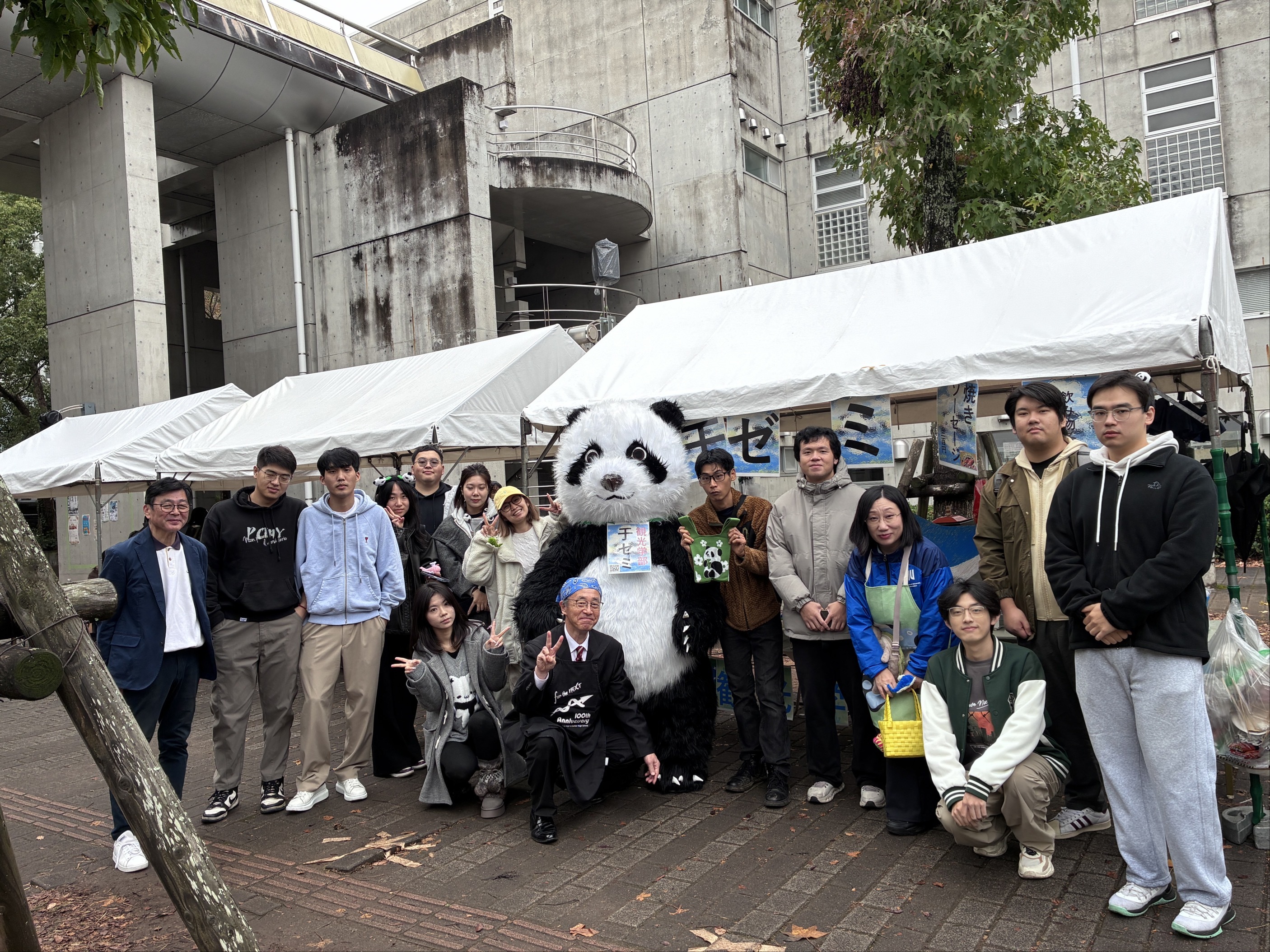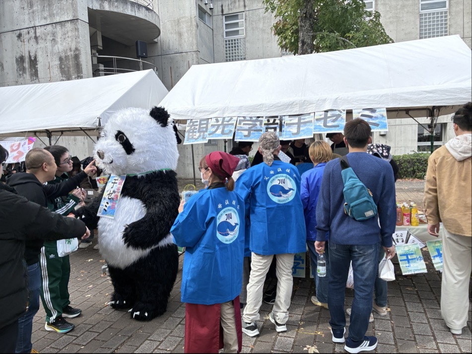 ブースでは、「湯(温泉)×癒し」をキーワードに、温泉観光士資格を取得した学生を中心に、温泉かごやオリジナル癒しタオル、手作りマスコット、中華風焼きソーセージ(テント販売)などを企画・販売しました。商品コンセプトの検討からデザイン、仕入れ、価格設定、ポスターデザイン、SNSを活用した事前広報まで、学生たちが主体的に試行錯誤を重ねました。当日はパンダのキャラクターも登場し、模擬店周辺は多くの来場者でにぎわいました。