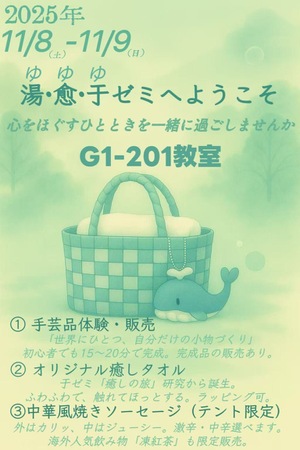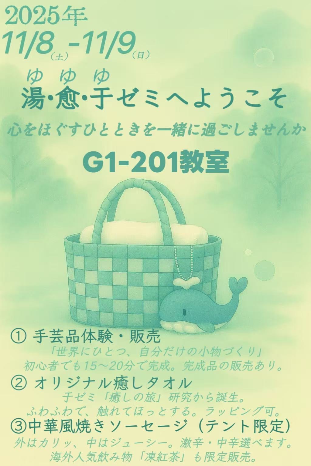 2025年11月8日(土)・9日(日)に開催された第34回JIUフェスティバルで、「湯・癒・于ゼミ」は昨年度に引き続き、ブース出店と教室展示を行い、「癒しのキャンパス」をテーマに来場者をお迎えしました。