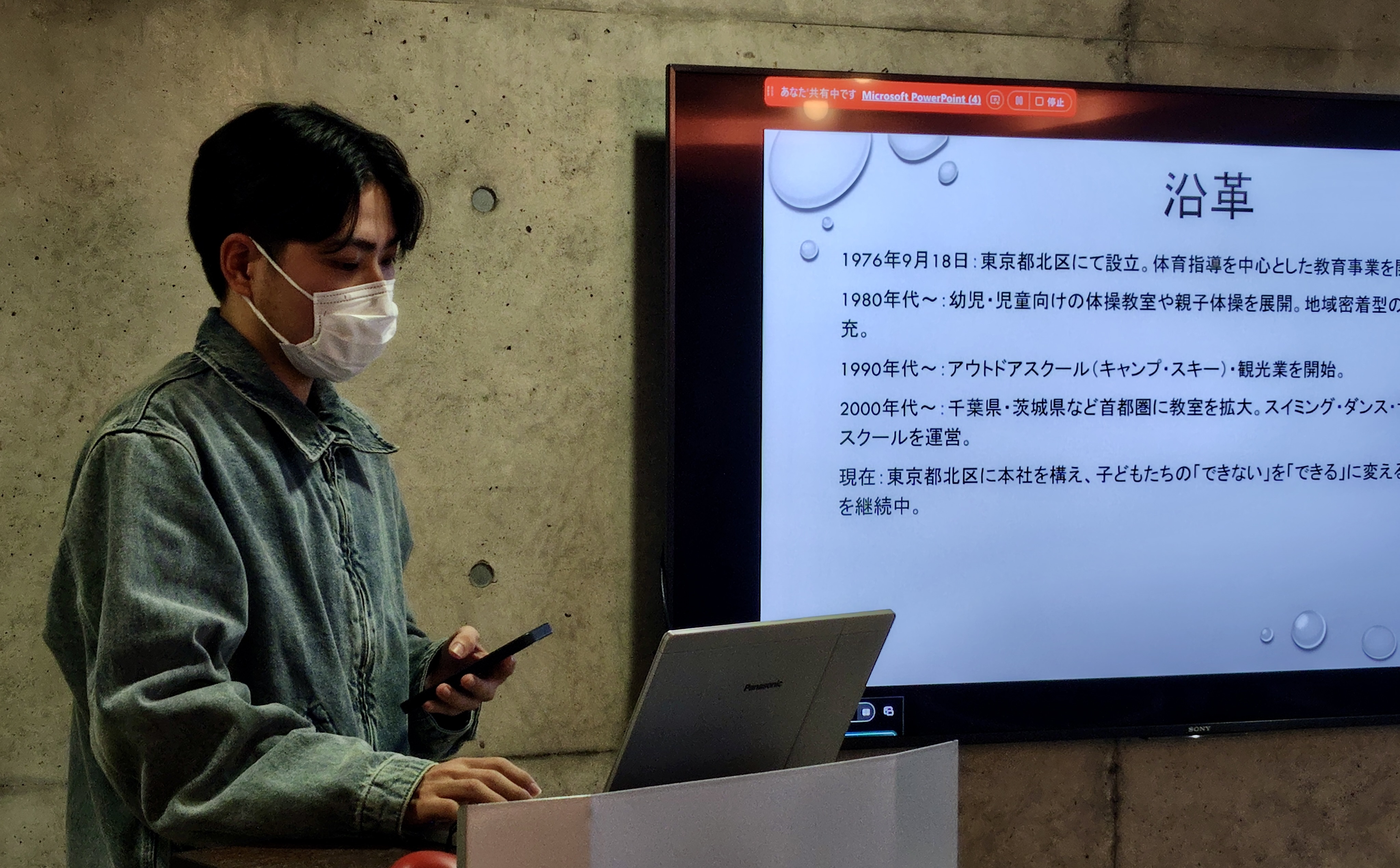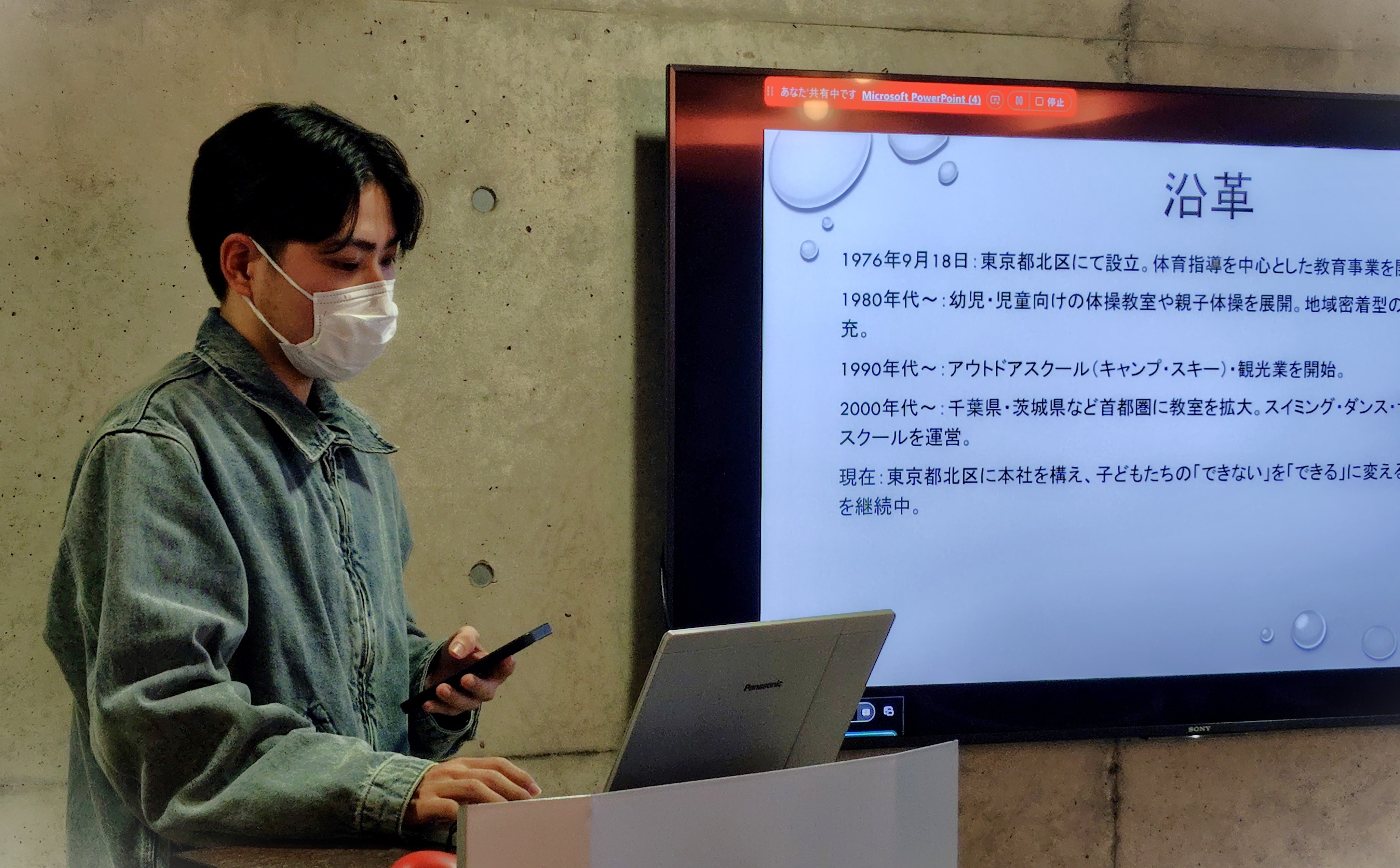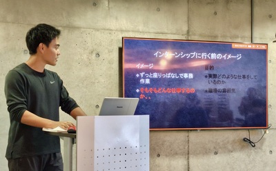 夏休み期間を利用してインターンシップに参加した3年生が10月下旬に口頭発表会に参加しました。当日は、東京紀尾井町キャンパスと千葉東金キャンパスをオンラインで繋いで各自の就業体験の発表と意見交換が行われました。発表内容は、東京紀尾井町キャンパスではIT、千葉東金キャンパスでは市役所、教育、スポーツ・アウトドア、金融と、それぞれのキャンパスの学びを象徴する多様なラインナップとなり、学生同士や教員からの質疑応答も活発に行われました。