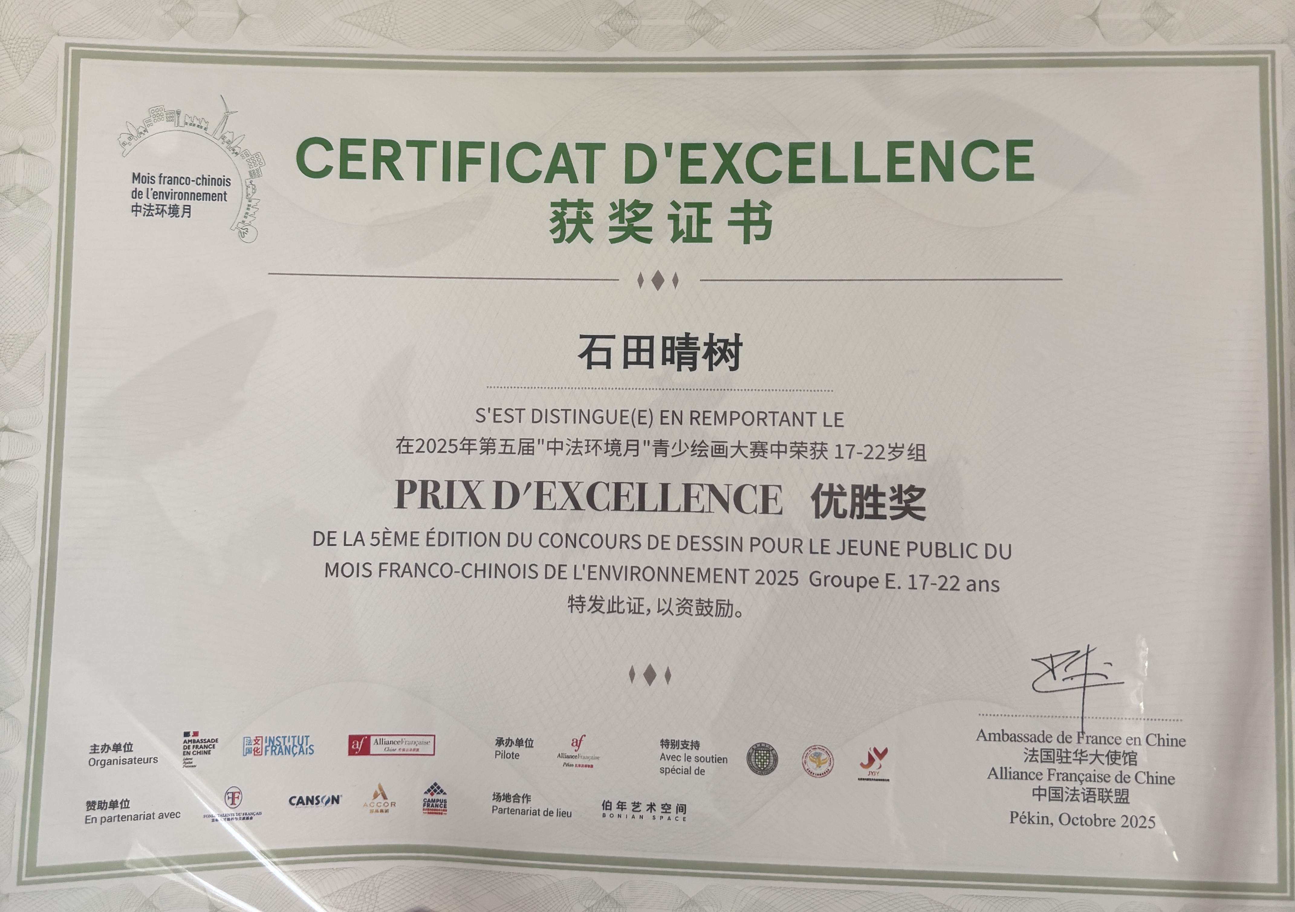メディア学部ニューメディアコース4年生の石田晴樹さんの映像作品が11/5に北京言語大学で開催された「中国フランス環境芸術祭 青少年芸術コンクール 17~22歳部門亅にて入賞し、北京で展示されました。さらに新人作家に送られる賞、“Prix de potentiel spark”賞を受賞し、ダブル受賞を果たしました。