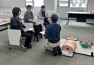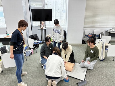 成人・小児・乳児の一次救命処置(BLS)に必要な基礎知識をオンライン学習を通して学んだあと、学内でインストラクターの方から、マンツーマンの実技講習を受講しました。