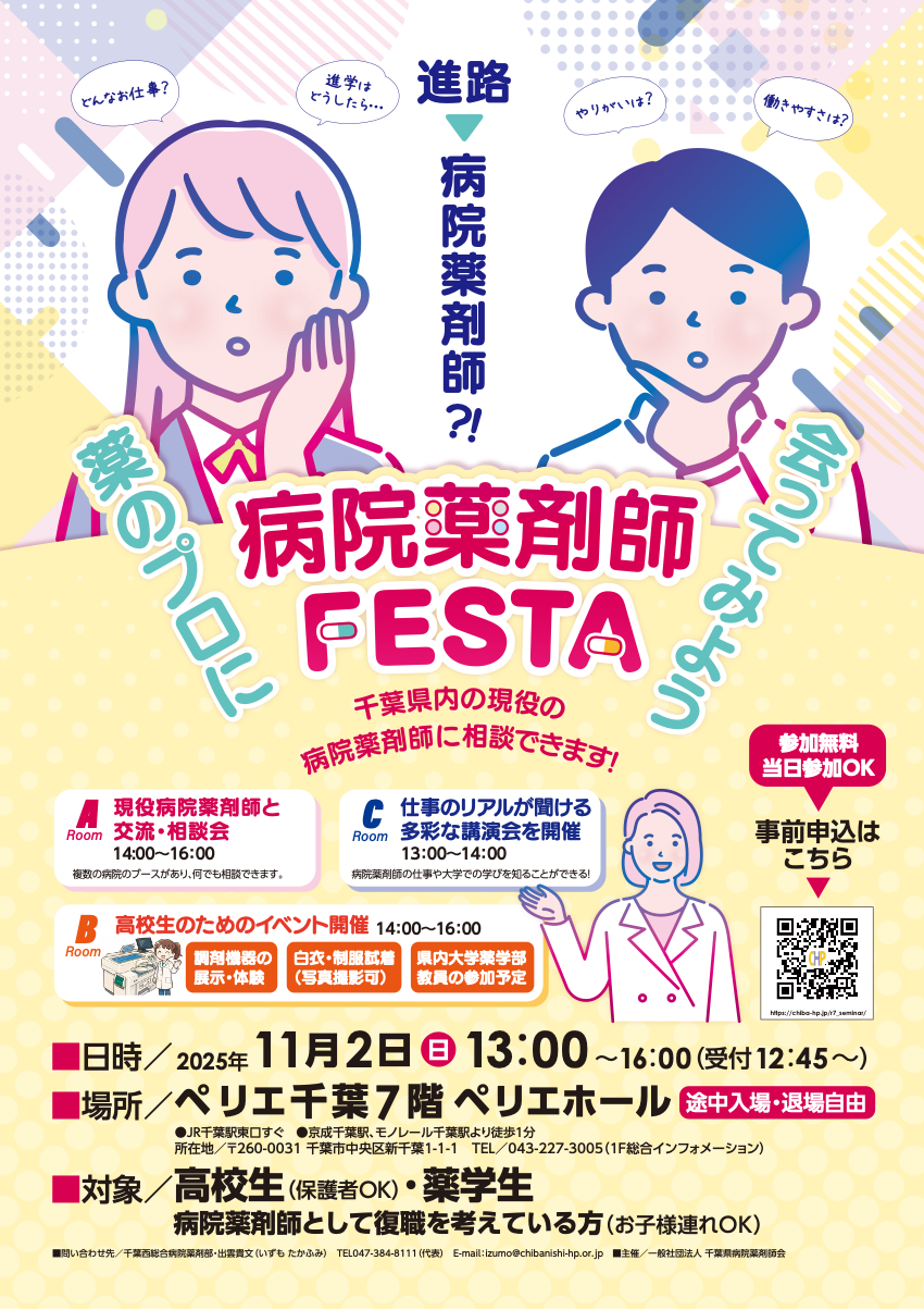 令和7年11月2日(日)に、高校生・薬学生、または病院薬剤師としての復職をお考えの方を対象に「病院薬剤師FESTA」(主催:一般社団法人千葉県病院薬剤師会)が開催されます。(参加無料)