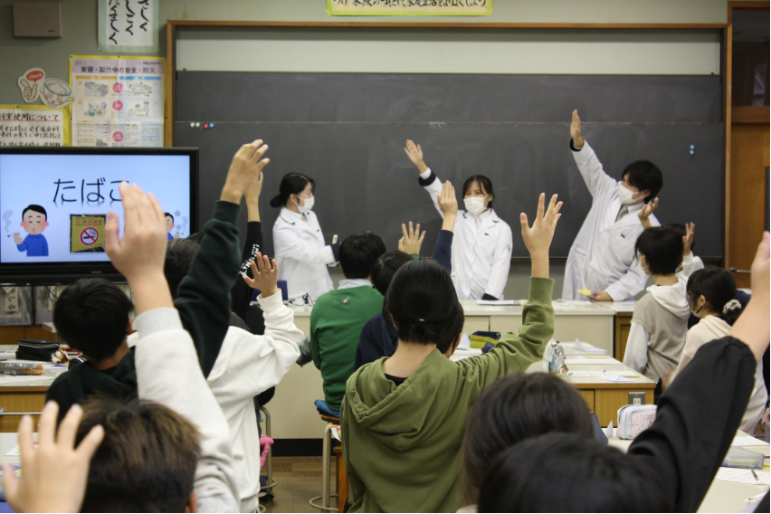 本学5年生が東金市内の6つの小学校で、小学生を対象とした薬物乱用防止啓発活動を実践しました。地域の方を対象とした健康に関する啓発活動は薬剤師の役割の1つです。