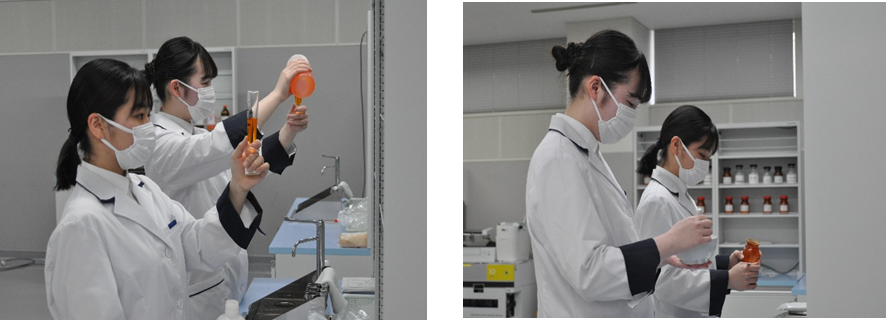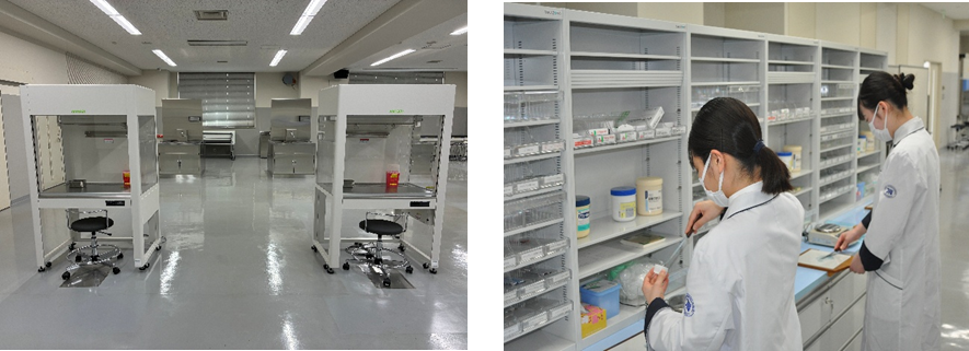 本実習室では、実際の薬局・病院業務に近い環境を再現し、調剤に必要な一連の流れを実践的に学ぶことができます。調剤台や分包機、秤量機器などを整備し、薬の取り揃え、注射剤、散剤、水剤、軟膏調剤など、より現場に即した実習が可能となりました。