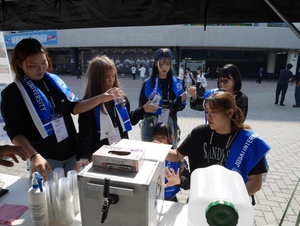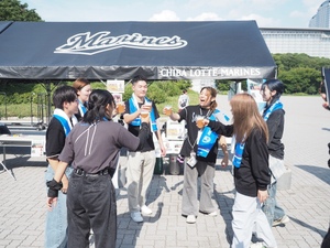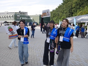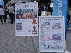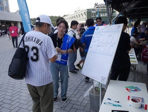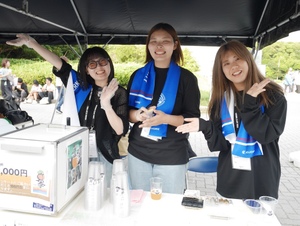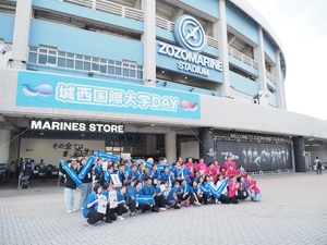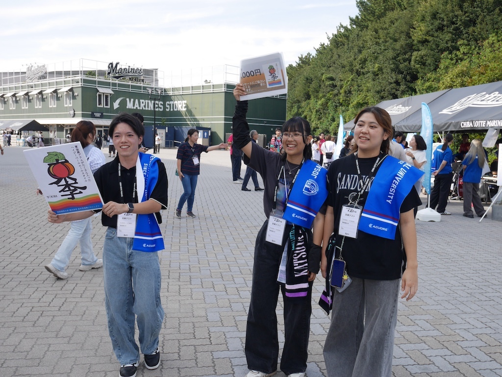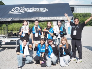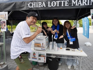 本学は9月28日のプロ野球千葉ロッテマリーンズ対北海道日本ハムファイターズ戦に冠協賛しました。試合の名称は「城西国際大学DAY」で、会場となるZOZOマリンスタジアム球場外周特設ブースにて、「観光プロジェクトB」の学生が自らの手で開発した「東李-TOURI」を初めて対面販売しました。