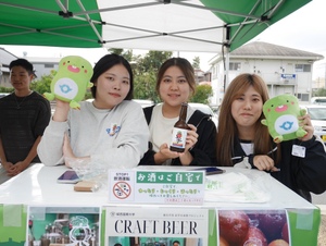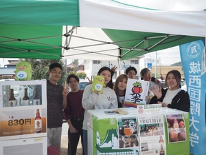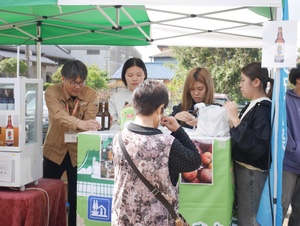 10月10日東金の日に、道の駅みのりの郷東金でボトル「東李-TOURI」の発売を開始し、学生が対面販売をおこないました。近隣の方から、遠方の観光客の皆さんまで、たくさんのお客様にお越しいただき、学生は「東李-TOURI」のネーミングに込めたこだわりや、開発の苦労話などをしながら交流を深めました。開始後わずか数時間で準備した本数はすべて売り切れとなりました。学生たちは自ら開発した「東李-TOURI」を直接お客様にお届けすることができ、感無量の様子でした。