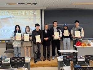 【2025年10月25・26日】日本温泉地域学会主催「温泉観光士養成講座」(会場:杏林大学)に、観光学部・于航ゼミナール所属の学生6名が参加しました。受講生は「地学」「化学」「生物学」「工学」「経済学」「医学」「観光学」「歴史学」「法学」の9分野から、温泉に関する知識を体系的に学修しました。修了試験に合格した学生には、日本温泉地域学会・石川理夫会長より「温泉観光士認定証」が授与されました。