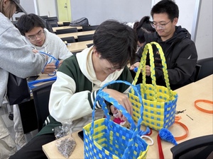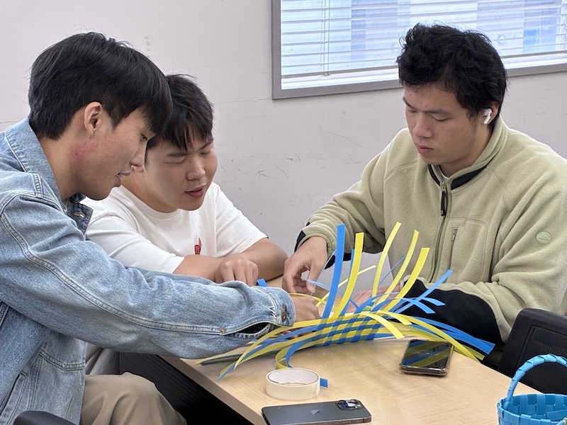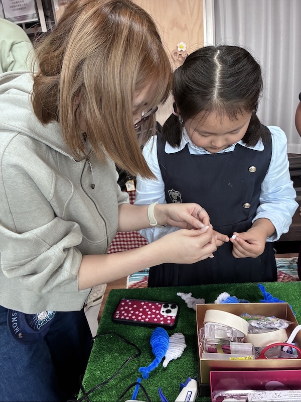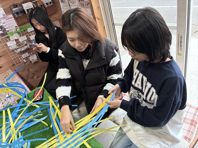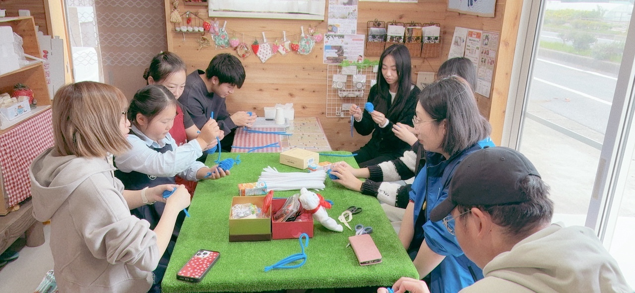 当日は、観光学部の学生が講師役となり、手作りカゴや小物の作り方を子どもたちにわかりやすく説明しました。材料の準備からデザイン、作業手順の工夫、安全面への配慮まで、学生自らが試行錯誤を重ねてプログラムを構成しました。ワークショップを通じて、参加者同士の会話が弾み、「つくる楽しさ」を共有することで、大学生・地域住民・観光客の三者がつながる時間となりました。