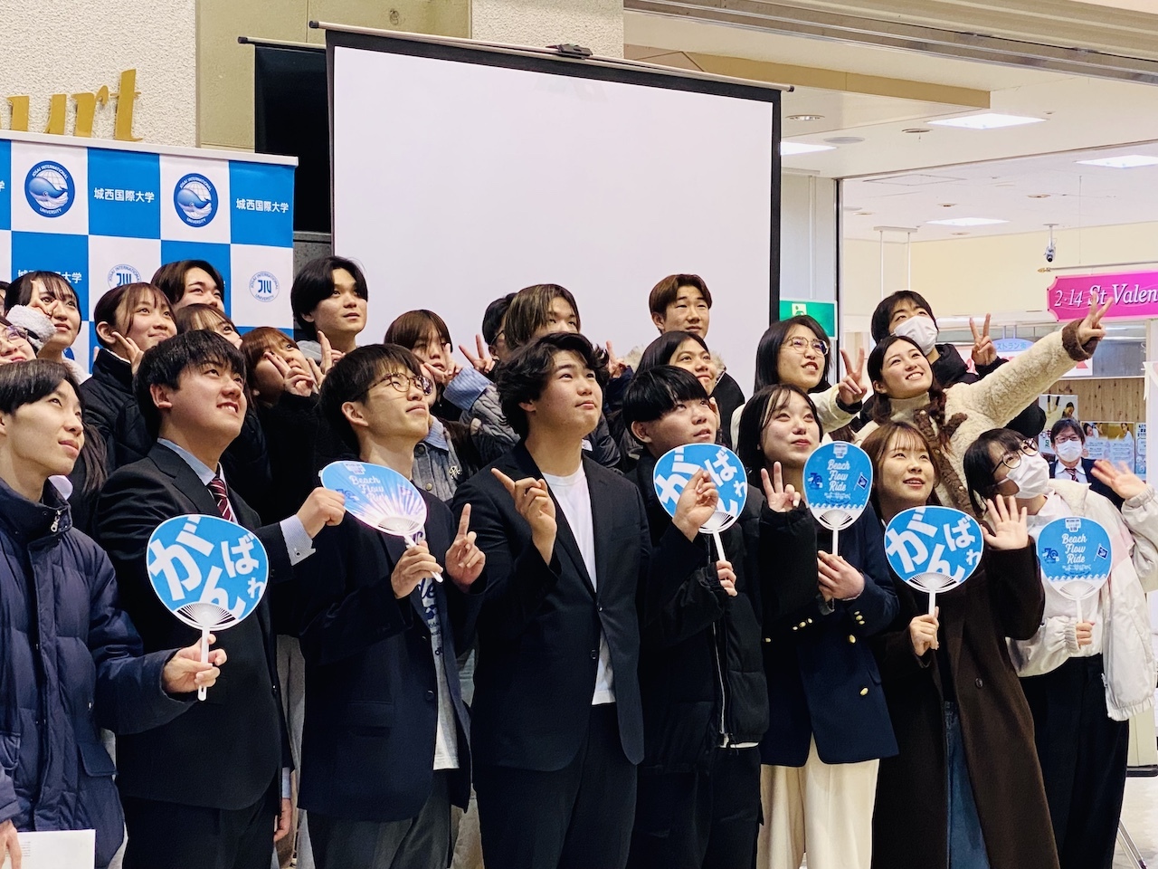 サイクリストを応援したうちわを持って他の域学共創プロジェクト参加学生と記念撮影