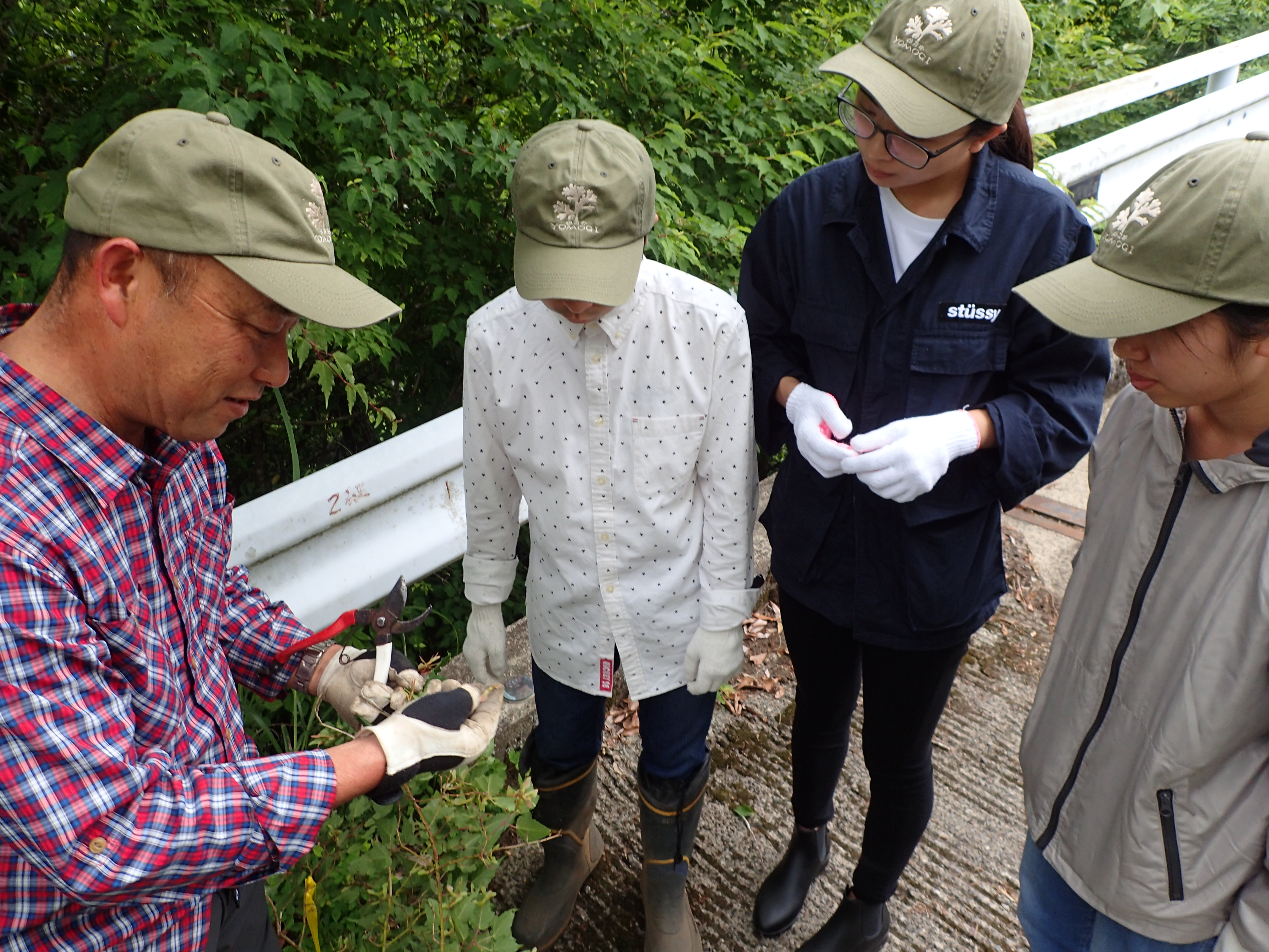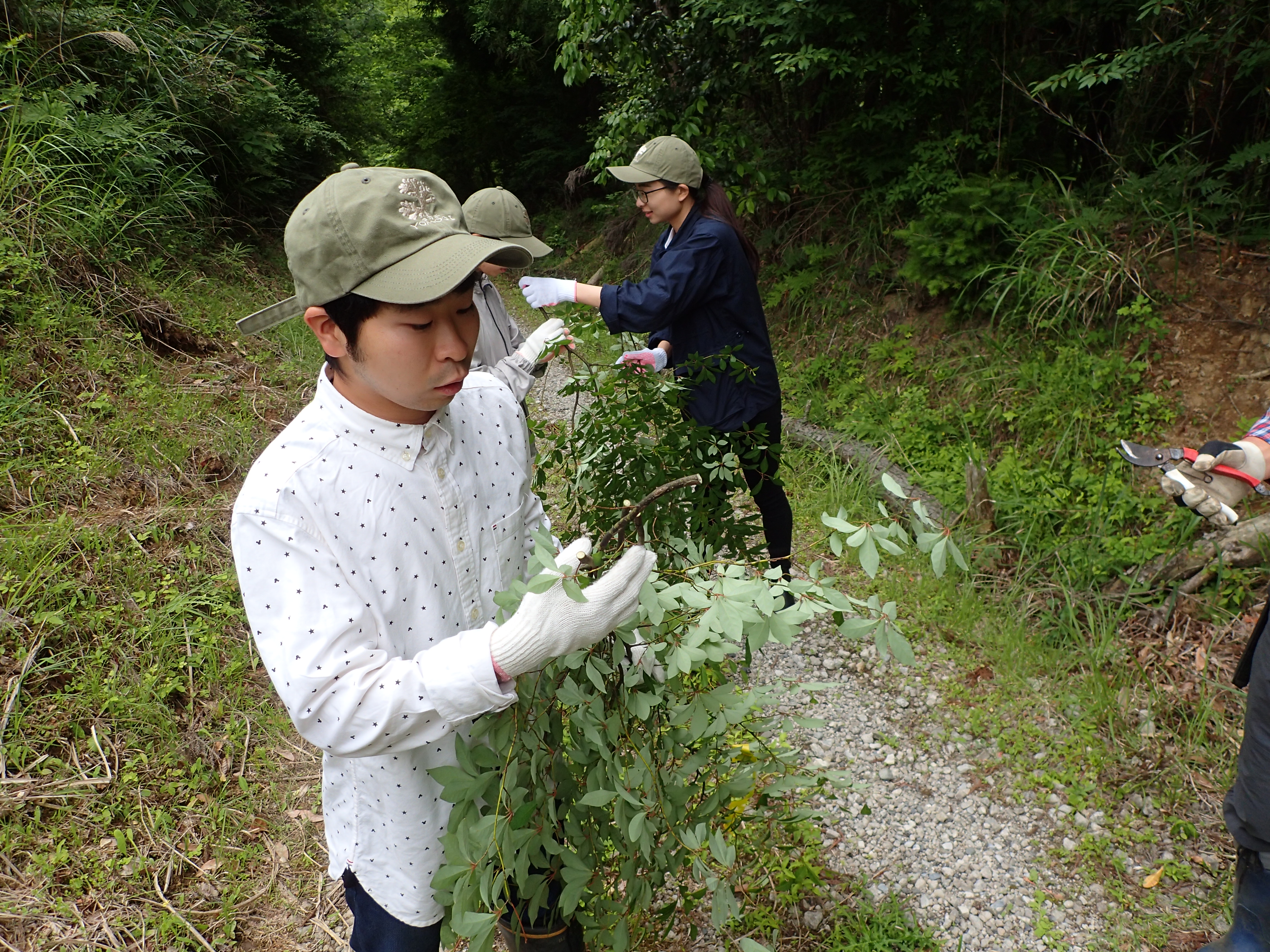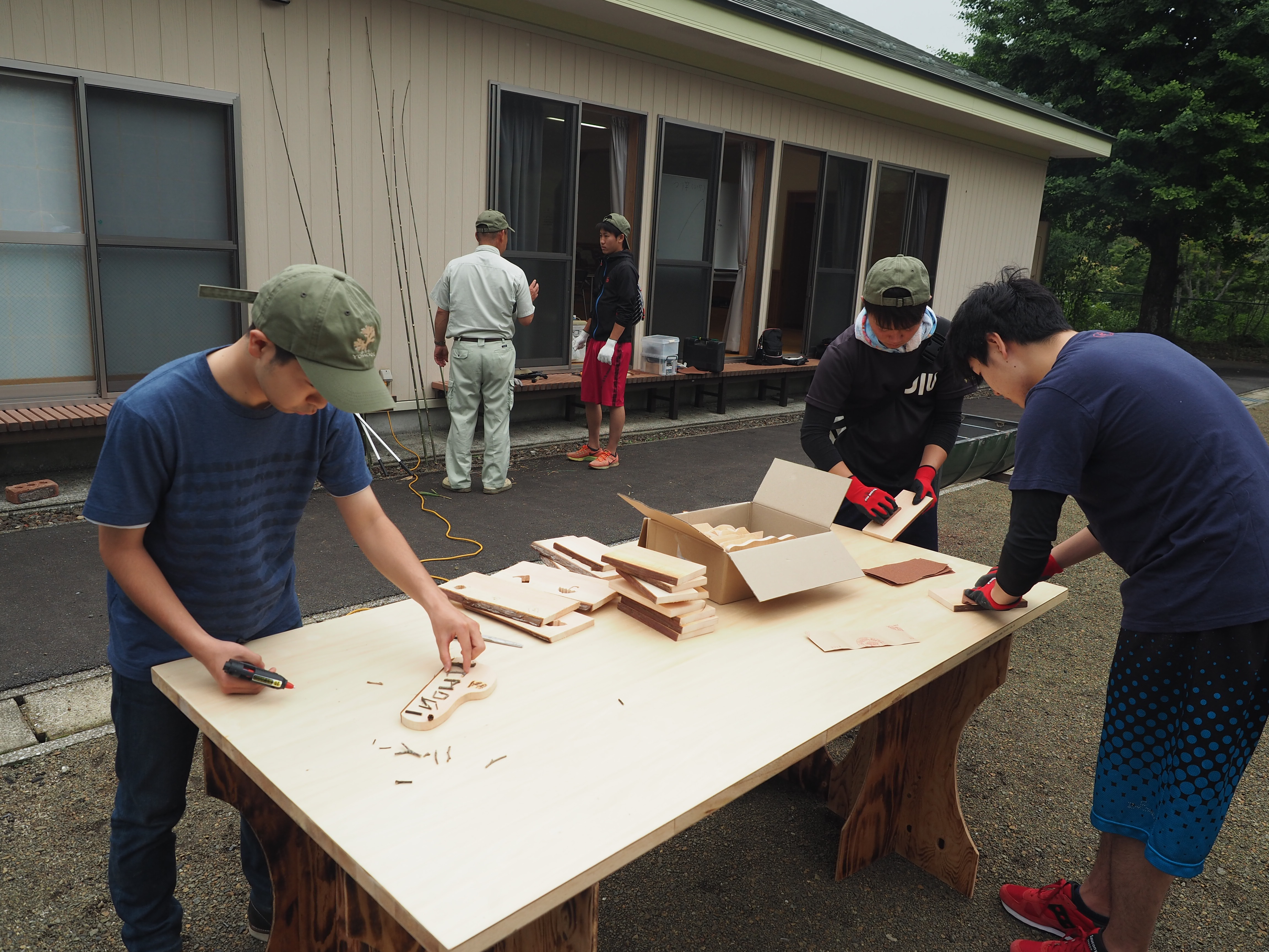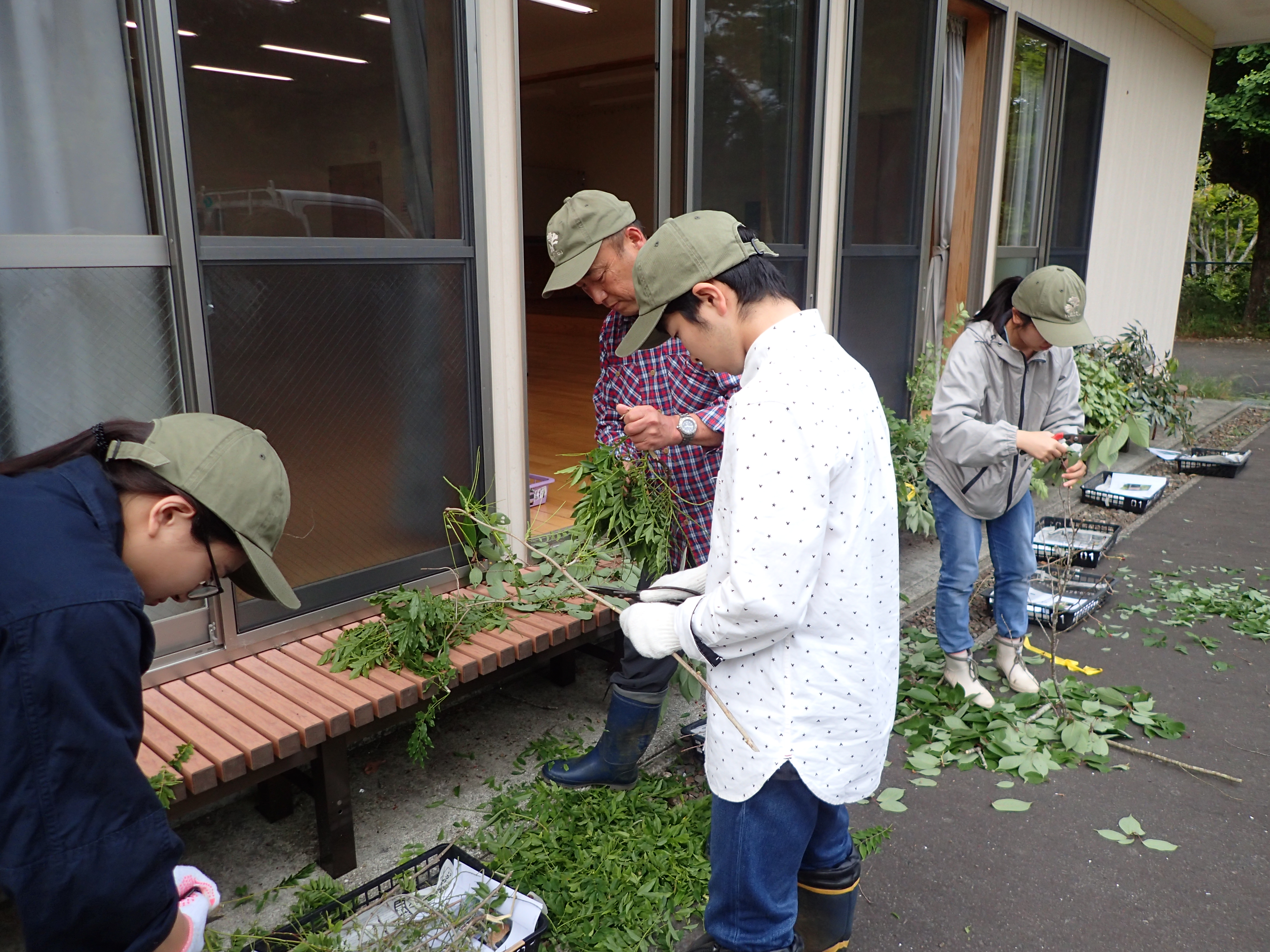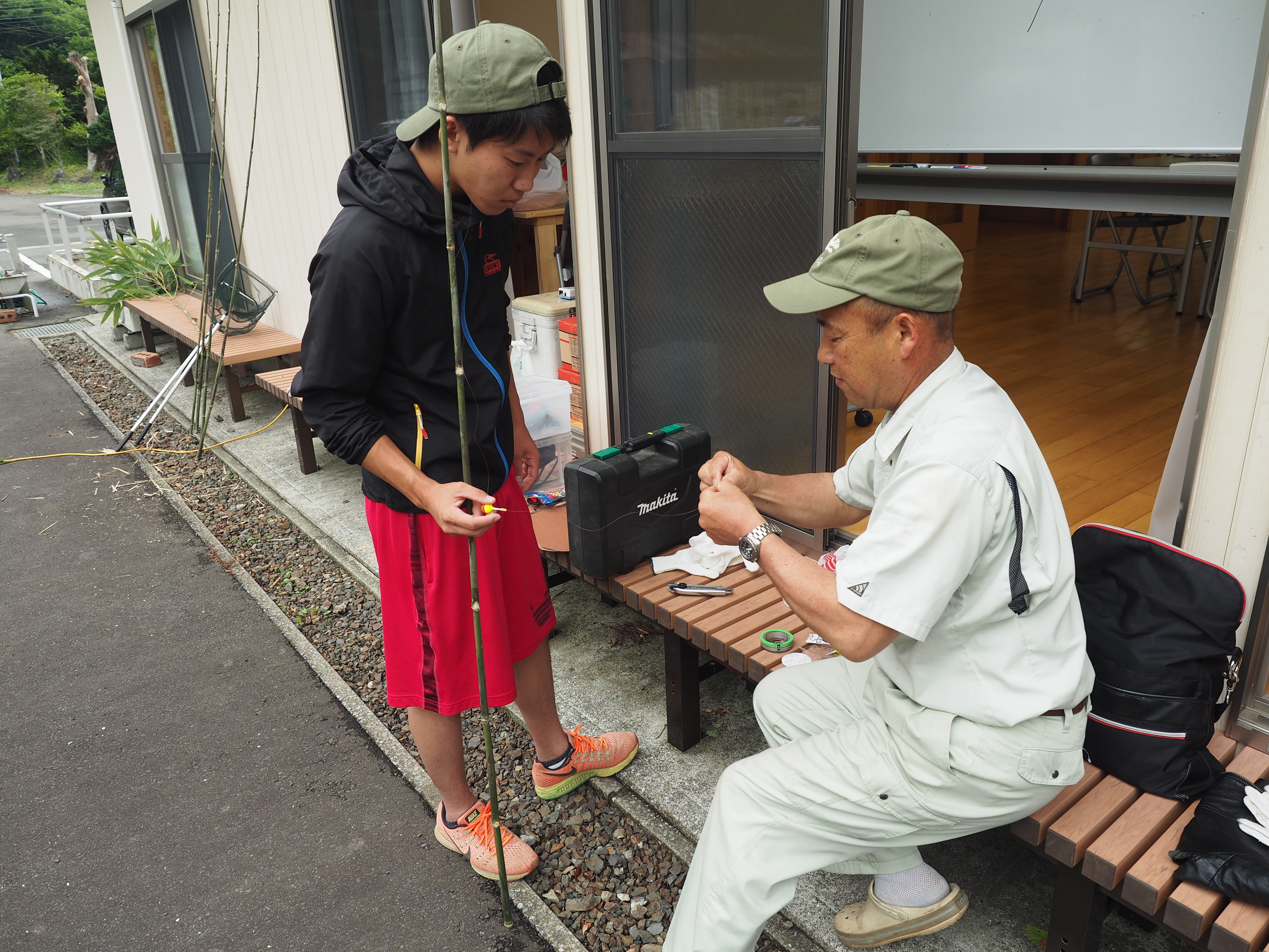 ゼミ生全員で「田舎で夏遊び」イベントの準備を始めました。イベント自体は7月後半でしたが、その準備のために6月から打ち合わせはじめ、何度も四方木地区に通いました。最初に準備に取り掛かったのは、釣り竿の仕掛けづくりでした。この仕掛けづくりや竹竿に釣り糸と仕掛けを結びつけるのが難しく、だいぶ苦戦しました。授業時間を使って、みんなで釣竿づくりをした経験は忘れられません。また、ネームプレートで使用する小枝の解説シートは、私たち学生がそれぞれのアイデアでデザインしたものでした。私は、イロハモミジの解説シートを作成ました。