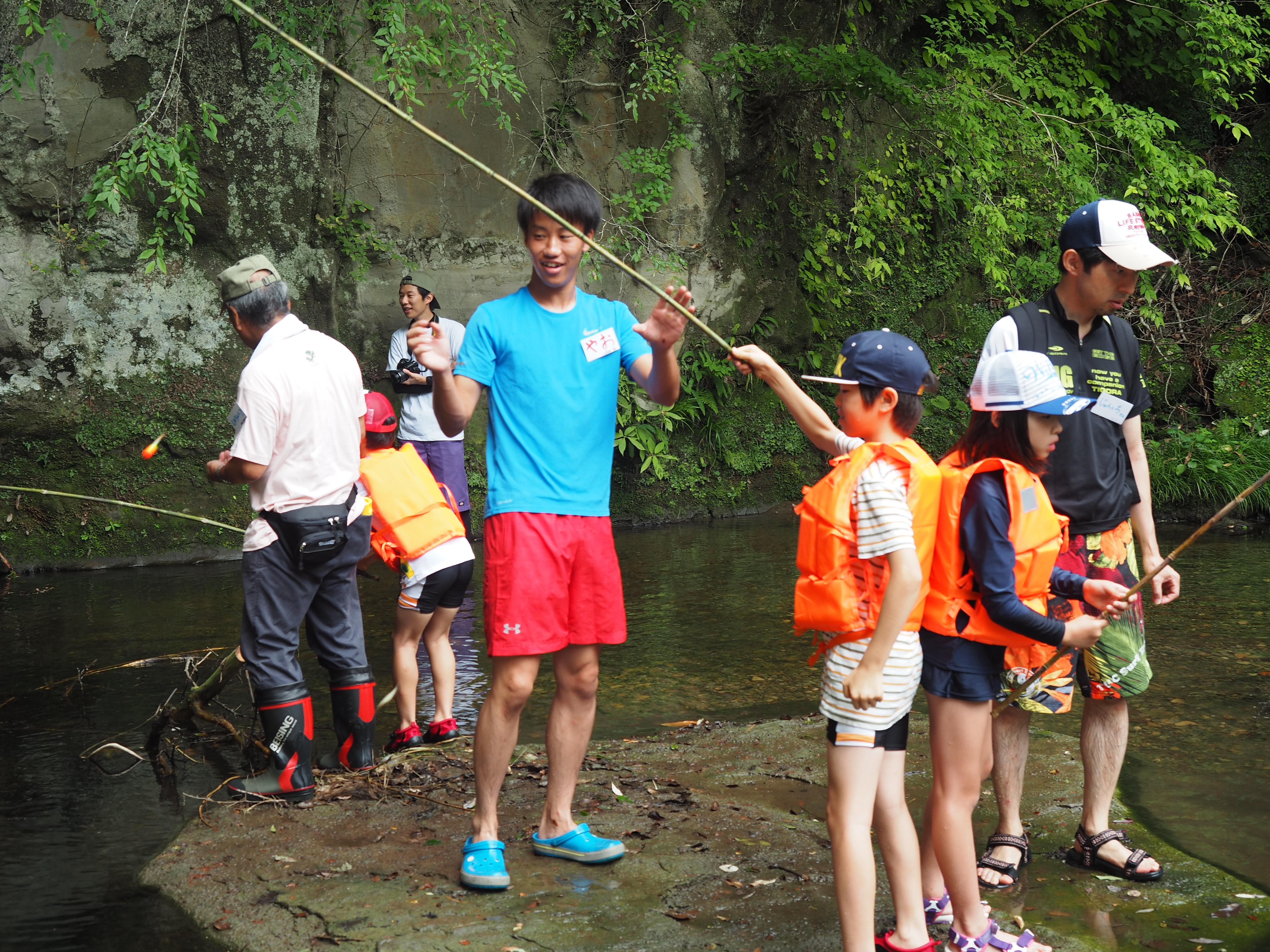 今回、イベントに企画段階から関わらせていただいた中で、私は川遊びを担当させていただきました。釣り竿の作り方や魚の釣り方、生き物の説明や川辺の誘導など、川で楽しく遊ぶため、安全管理も含めて地元の方と協力して取り組みました。川底が滑りやすく、足場が悪い中ではあったのですが、子どもたちが楽しそうにしている姿を見て、私自身もうれしく思いました。子供達は、川の生き物に予想以上に興味を持ってくれて、真剣に話を聞いてくれていました。目的地である川のトンネル「甚兵衛穴」に向かいつつ生き物を探してもらうはずが、じっと生き物を見つめているうちに、しばらく足が止まって声をかけるまで観察している子供もいるぐらいでした。